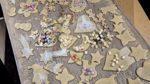Zunächst durften die Kinder ganz viele verschiedene Formen an Keksen ausstechen und diese auf ihr großes Backblech legen. Sobald dieses voll war ging es an das verzieren.